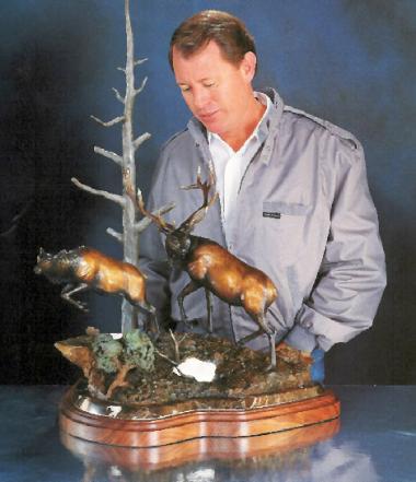 "Company's A-Comin' " This bronze depicts a bull elk in his prime moving his cows to higher ground. The cow elk, who always leads, is instinctively more aware of danger at this point. She has detected something behind them that alerts her, so she is moving on with a leap. The bull, with other things on his mind right now, is just beginning to realize that "Company's A-Comin' ". $9500 US |