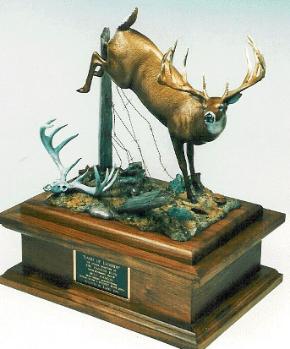 "Land of Legends" This is the only authorized bronze of the Hanson Buck, the new World Record whitetail deer taken by Milo Hanson. The bronze depicts the Hanson Buck breaking down the barrier set up by the Jordan Buck, which held the record for nearly 80 years. The Jordan Buck is sculpted to scale and is now left on the other side as a fallen record. After breaking down the barrier the Hanson Buck has now landed in the "Land of Legends." This bronze comes with a Certificate of Authenticity signed by both Larry Gay and Milo Hanson. Retail Price is $6,500.00 |