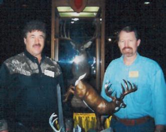 Pictured at left are Milo Hanson and Larry Gay at the Dixie Deer Classic in Raleigh, NC, at the unveiling of the bronze. The Hanson Buck is seen in the background in the glass case. |