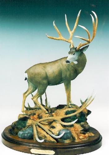"Legends of the Fall" Pictured above is Doug Burris, Jr. with his world record typical mule deer taken in 1972 in Colorado. The monster has a Boone and Crockett score of 226 4/8 and is still the #1 in the world. "Legends of the Fall" is a scale model replica of this trophy for you to enjoy for years to come. Laying at the feet of the deer are scale model sheds from the Hanson Buck, world record whitettail, and the Plutte Bull, the then world record elk. All three trophies are sculpted to the same scale for you to compare and enjoy. This bronze has an edition of 49 with only a few left. $7000 US |