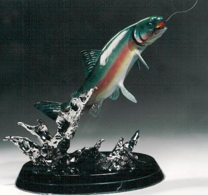 ".... and then the line broke." How may times have you heard a fish story end this way? This bronze depicts that final second when you see the trophy break water, hook in his mouth, and six inches of your line that leads to thin air. This piece stands approximately 22" tall, has stainless steel water, and a double marble base. Retail price is $7500.00 US. |