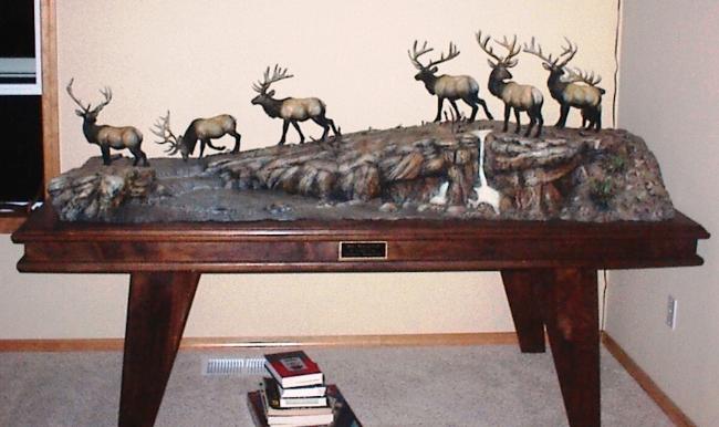 This table is patterned after the wonderful painting by Larry Zabel. It was done with his permission and is the picture used by the Rocky Mountain Elk Foundation as the giant backdrop for the stage at the national conventions. This is very limited in edition size. Retail price on this very unique bronze is $35,000 US |