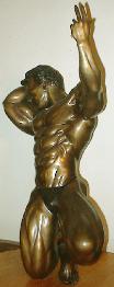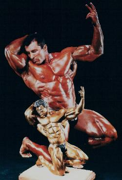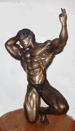 Pictured above is Milos Sarcev posing with his signature pose and the bronze comissioned by him. He now has the bronze on permanent display in his Gold's Gym in Fullerton, CA, where many photos are taken for Flex Magazine. |