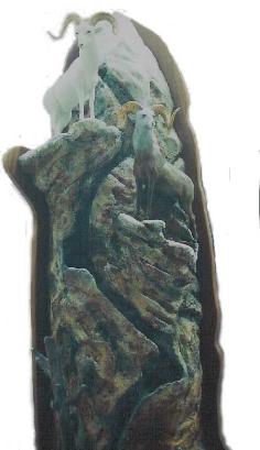 Pictured at left is the top of the corner table, which stands approximately 7' 9" tall. On the top is the Dall, or Yukon, sheep and directly below is the Stone's sheep. The photo on the right depicts an old hunter with his horse tied up for the night while he enjoys his coffe by the fire. He is overlooking his successful day of hunting, the freshly skinned Rocky Mountain Bighorn sheep skin and head draped over his tent. |