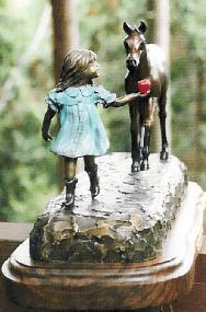 "Sweet Temptation" This bronze shows a young girl who has learned the easiest way to gain cooperation is with a reward. The young foal is following along, being tempted by the nice ripe apple she is holding. Approximately 20" long and 11" tall with an edition size of 20. $1800 US |