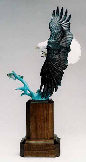 "Take-Out" This smaller eagle is done in an edition of 35 and portrays a bald eagle swooping down on a trout. The wingspan on the eagle is approximately 9" wide. It is available with either full color patina as shown or with a buffed out head and tail. There is also a choice of bases on this bronze. You may own it with either the walnut as shown, or with a 3" x 4" double-layer white marble base. |
